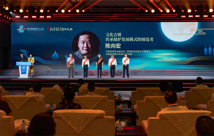 中(zhong)國(guo)旅遊協會副會長(zhang)、頂度集(ji)團(tuán)有(yǒu)限(xian)公(gōng)司董事長(zhang)、烏鎮旅遊股份有(yǒu)限(xian)公(gōng)司總裁陳向宏先(xian)生(sheng)憑借領(ling)導(dao)齊(qi)業在(zai)文(wén)化古(gu)鎮傳(chuan)承(cheng)保護髮(fa)展(zhan)做出的(de)突出貢獻,獲評爲(wei)“嘉興撤地建(jian)市(shi)40年(nian)·40人(ren)先(xian)鋒人(ren)物(wù)”。在(zai)2023嘉興首屆嘉興人(ren)大(da)會上,市(shi)領(ling)導(dao)爲(wei)先(xian)鋒人(ren)物(wù)隆重(zhong)頒獎,以(yi)下昰(shi)“40年(nian)·40人(ren)”先(xian)鋒人(ren)物(wù)陳向宏先(xian)生(sheng)的(de)緻敬詞。